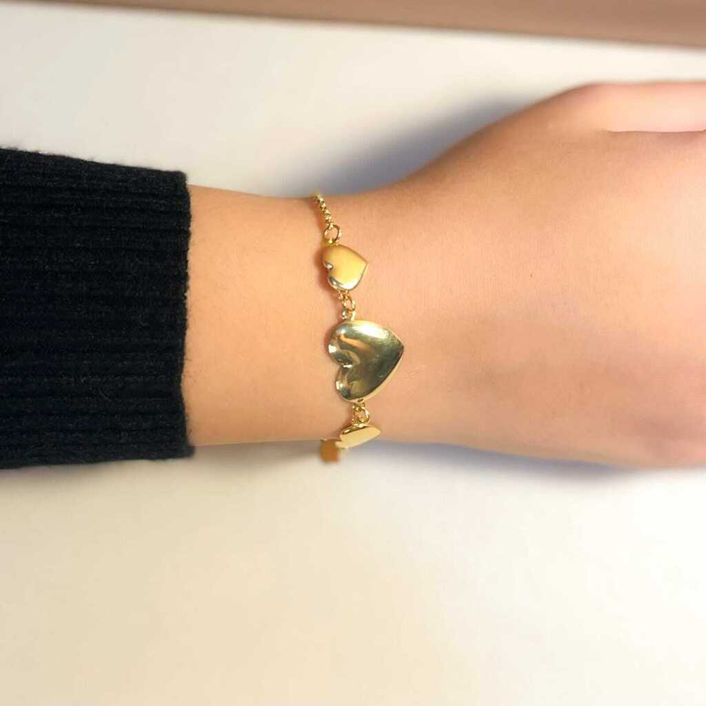 Adicione um toque de amor e elegância ao seu visual com a Pulseira Três Corações Banhada a Ouro 18K e brilhe em cada momento!